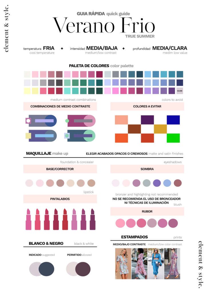El Verano Frío se caracteriza por una paleta de colores fríos, puros y moderadamente saturados con aspecto fresco y limpio. Esta estación combina tonos fríos con una claridad equilibrada, creando combinaciones puras y eficientes. Los colores fríos como el gris acero, azul marino, rosa frío y verde pino definen perfectamente este perfil cromático.